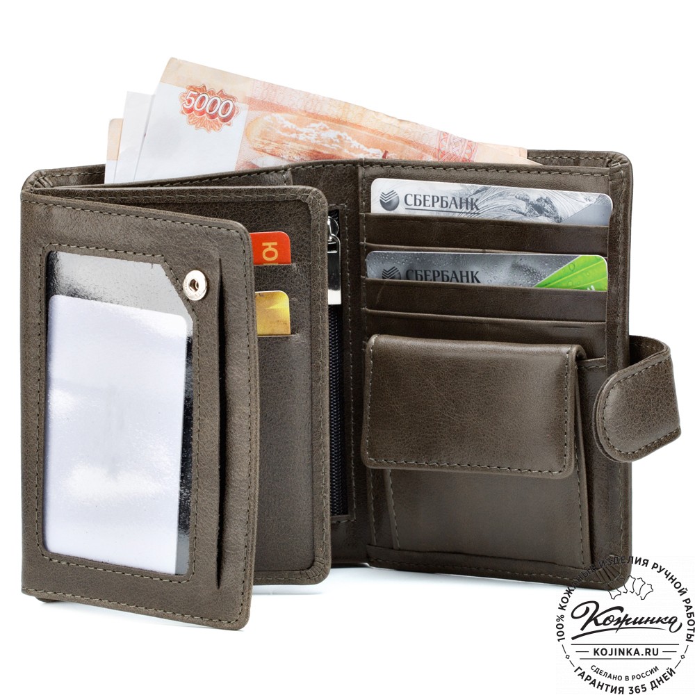 Кожаное портмоне "Пушкин" (оливковое) - вместительное стильное портмоне из мягкой качественной кожи.