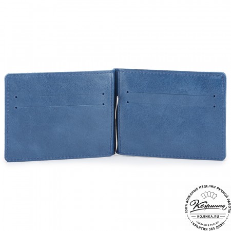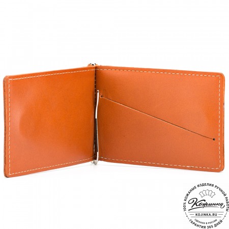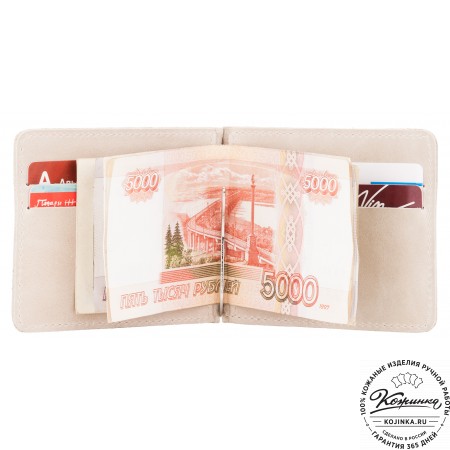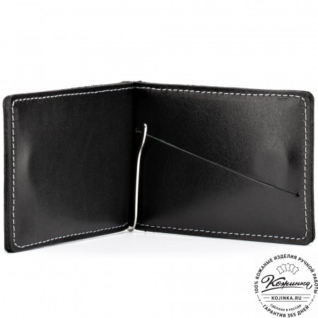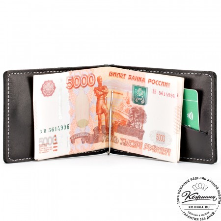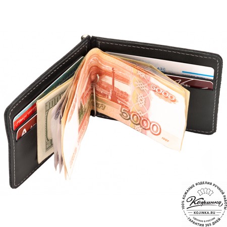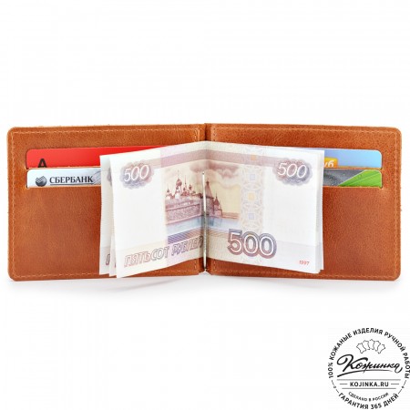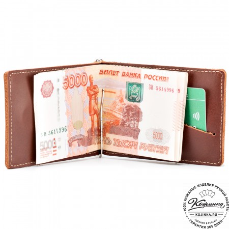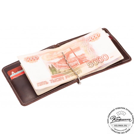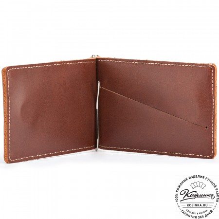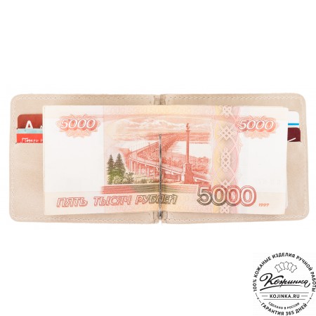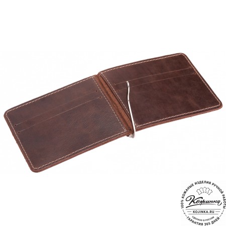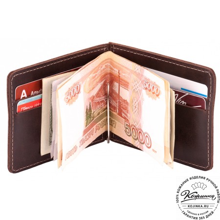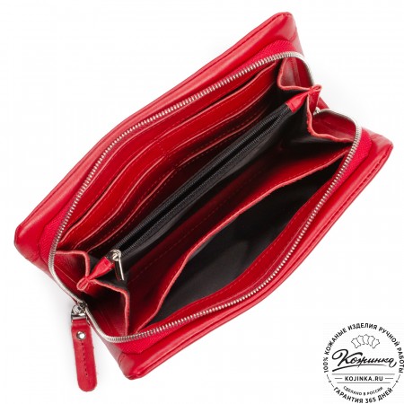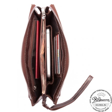 Внутри расположено отделение для купюр с перегородкой, на перегородке имеются карманы для карт, потайные карманы и пластиковый карман, отделанный кожей.