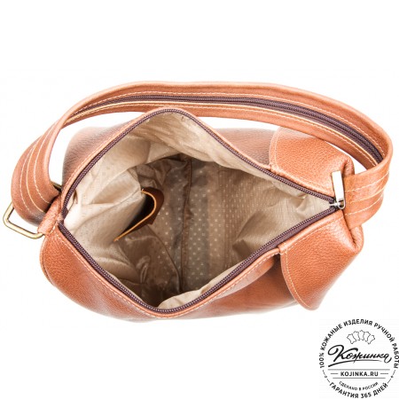 У сумки одно вместительное отделение, закрывается на молнию. Внутри карман на молнии для хранения ценных вещей и кармашек для телефона. Сумка выполнена на подкладке.