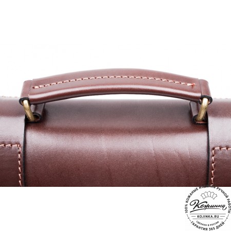 У портфеля прочная удобная ручка и кожаный плечевой ремень. Ремень съемный, крепится по бокам на небольшие карабины, регулируется по длине ременной пряжкой. Свободный конец ремня аккуратно фиксируется кожаным кольцом.
