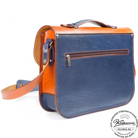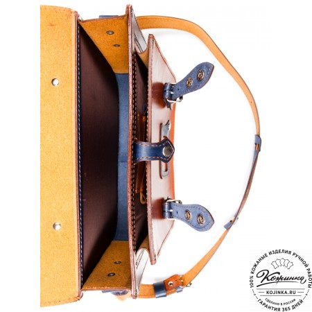 Портфель закрывается клапаном на два портфельных замка, спрятанных под ременными пряжками.
