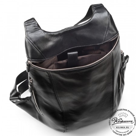 Основное отделение закрывается на молнию по диагонали. На задней стенке внутри есть карман на молнии.