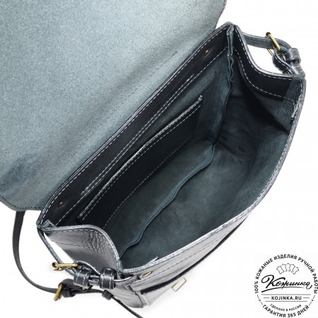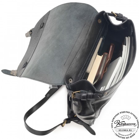 Три наружных кармана для мелких вещей. Внутри одно отделение без подкладки. Удобные кожаные лямки и ручка сверху.