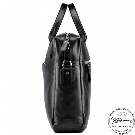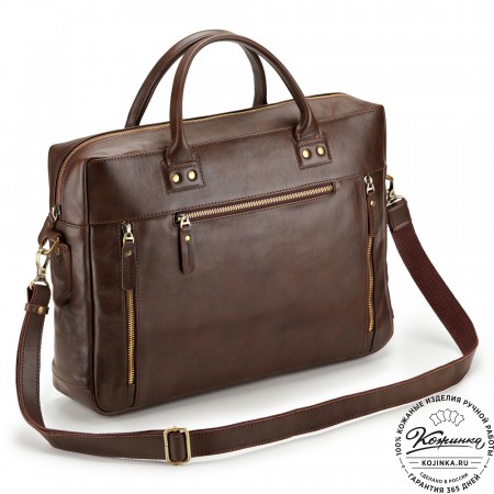 У портфеля прочная удобная ручка и кожаный плечевой ремень. Ремень съемный, крепится по бокам на небольшие карабины, регулируется по длине ременной пряжкой. Свободный конец ремня аккуратно фиксируется кожаным кольцом.