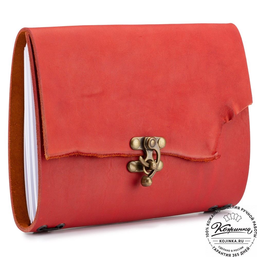 Обложка выполнена из толстой прочной кожи, а бумага внутри - сменная. Это может быть любая бумага формата А4, сложенная пополам. Удобное крепление на резинке позволяет легко и быстро менять бумагу.
