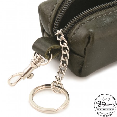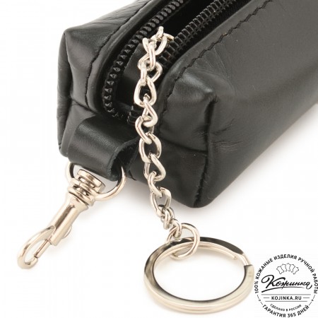 Внутри на кожаных петлях расположены металлическое кольцо для ключей и небольшой металлический карабин.